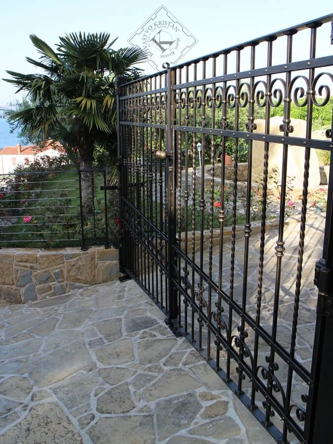 Bogato okrašena kovana dvokrilna dvoriščna vrata. Masiven in razgiban okvir naredi krilo togo in dobro vidno. Na vrhu in v krilu okras iz kovanih okraskov.
