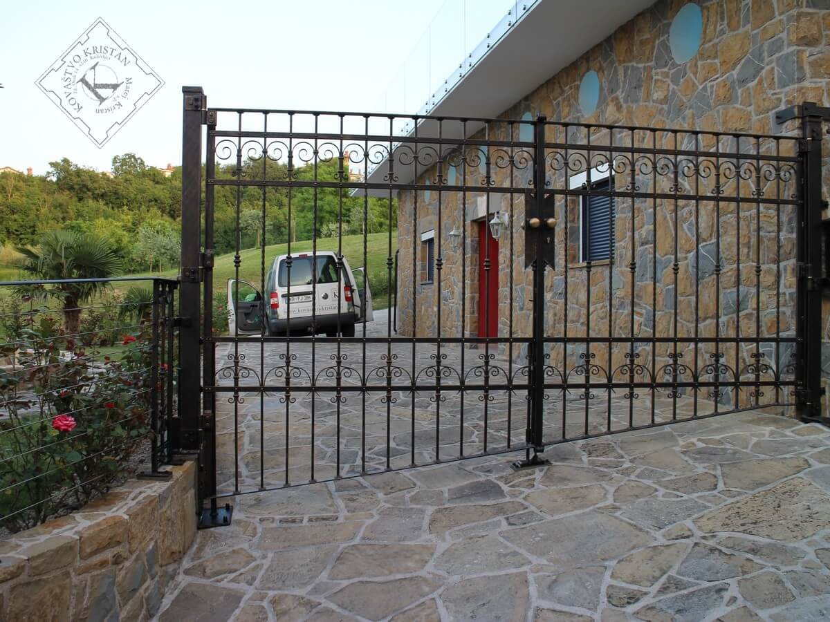 Velika dvokrilna dvoriščna vrata polne višine z ločenim osebnim prehodom Elegantno kovano okrasje.