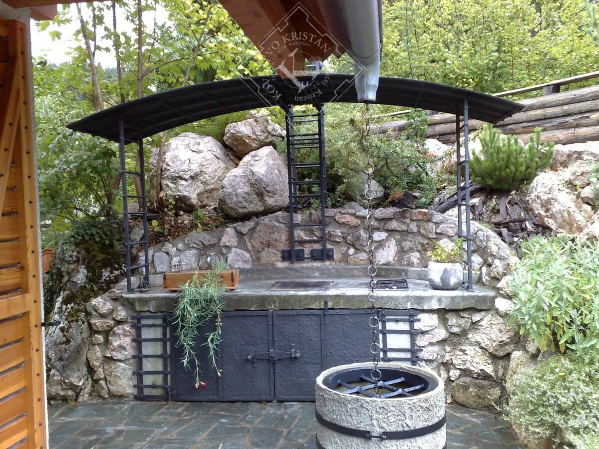 Kovana streha nad kaminom, tablo, balkonom in vrtom.